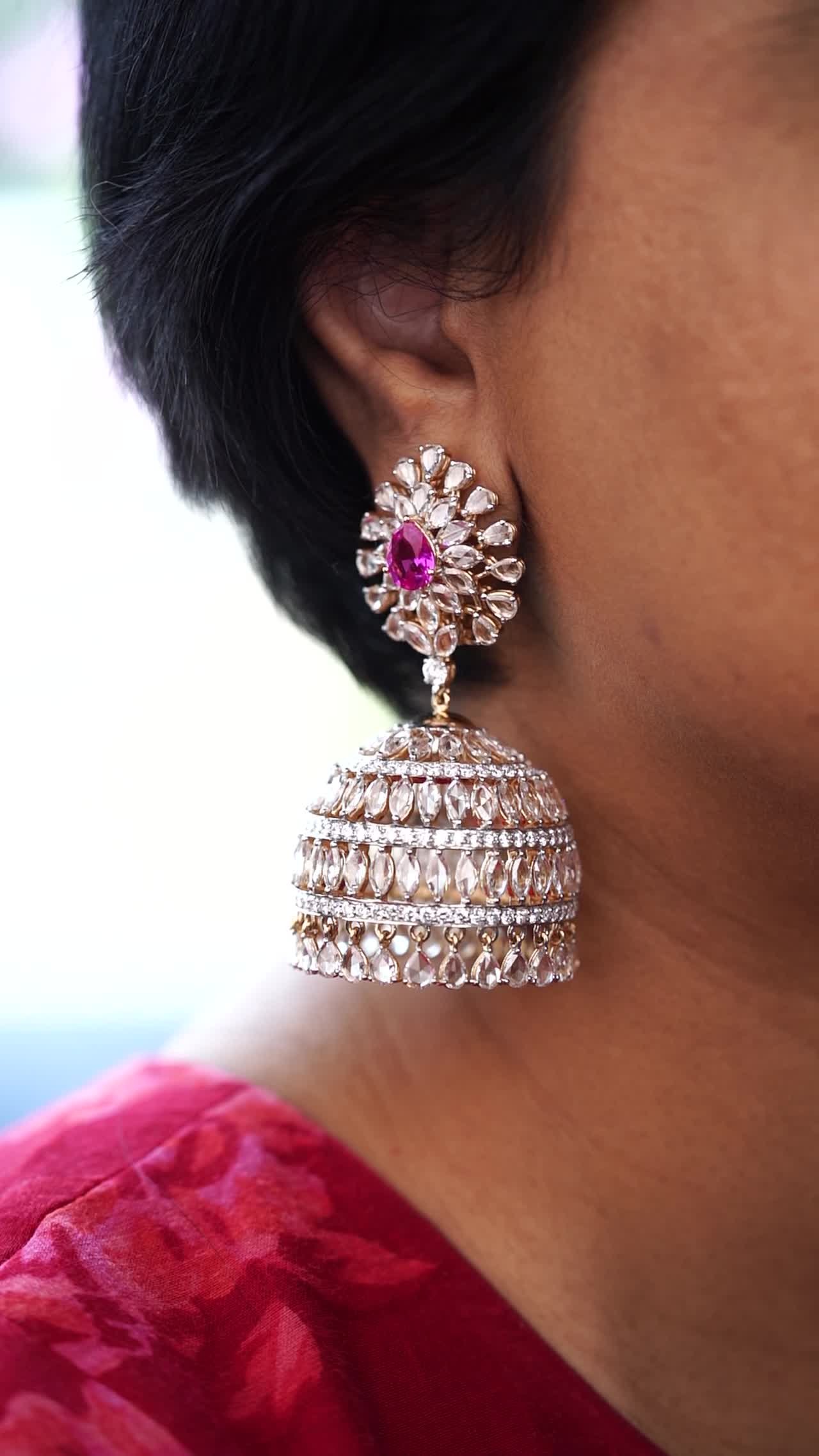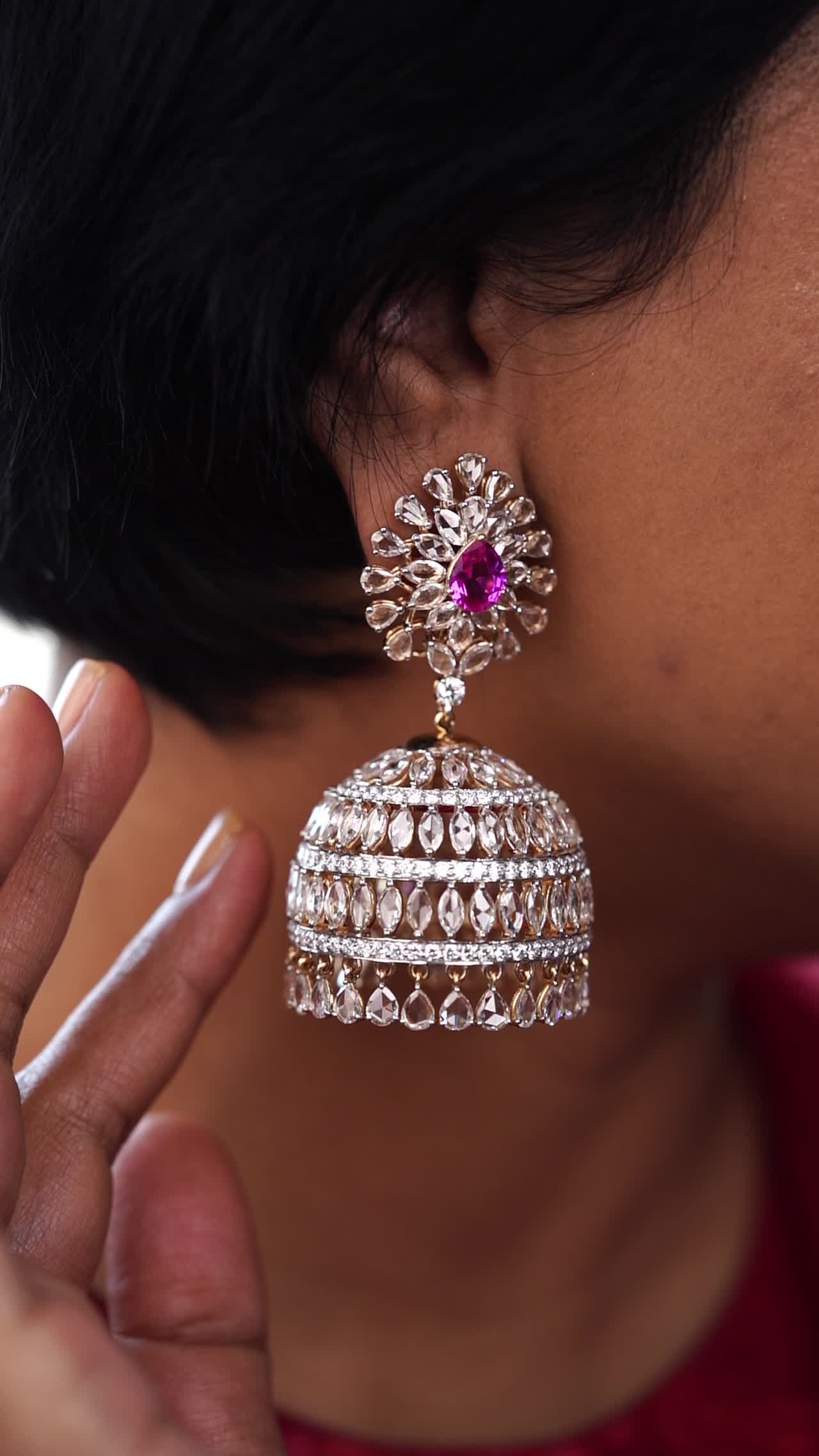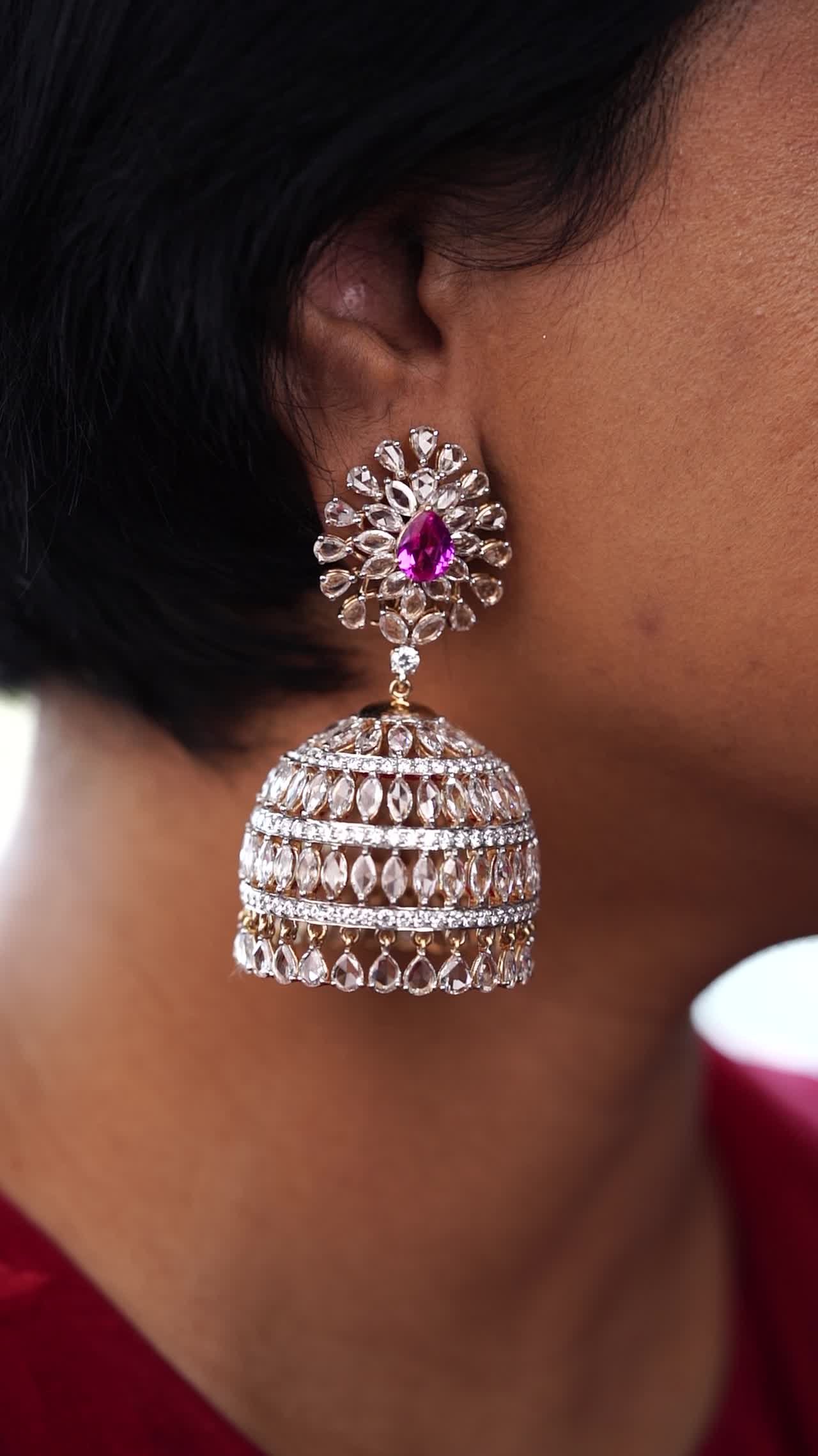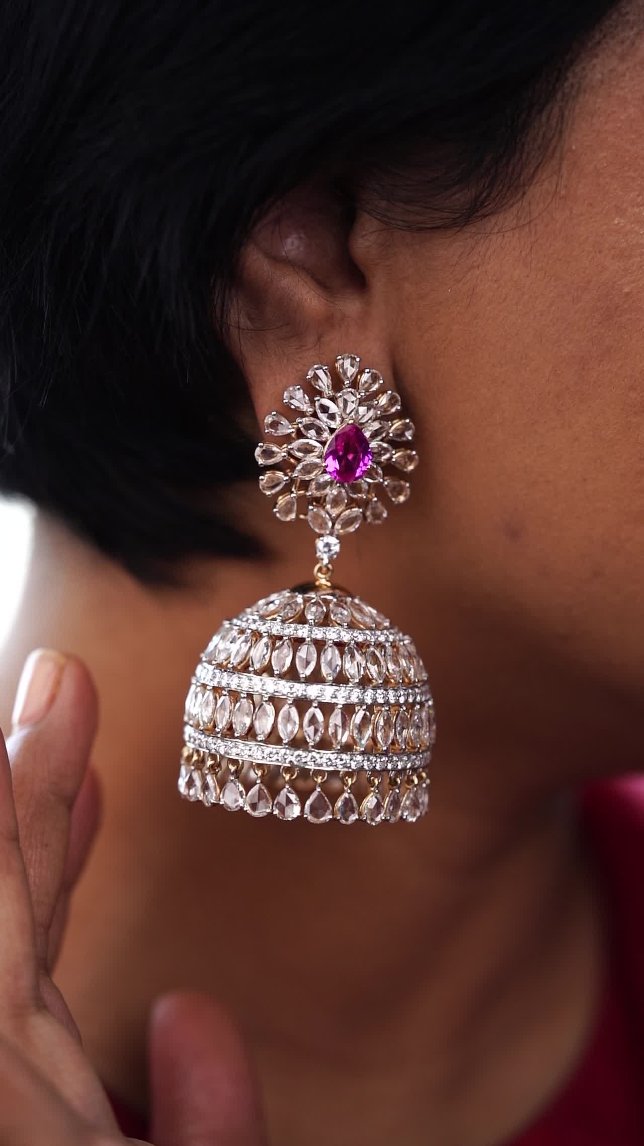 These are lab-grown diamond jhumka earrings with a pink marquise stone at the top and a sparkling diamond-encrusted dome-shaped pendant.