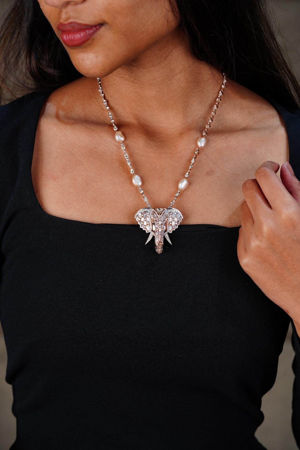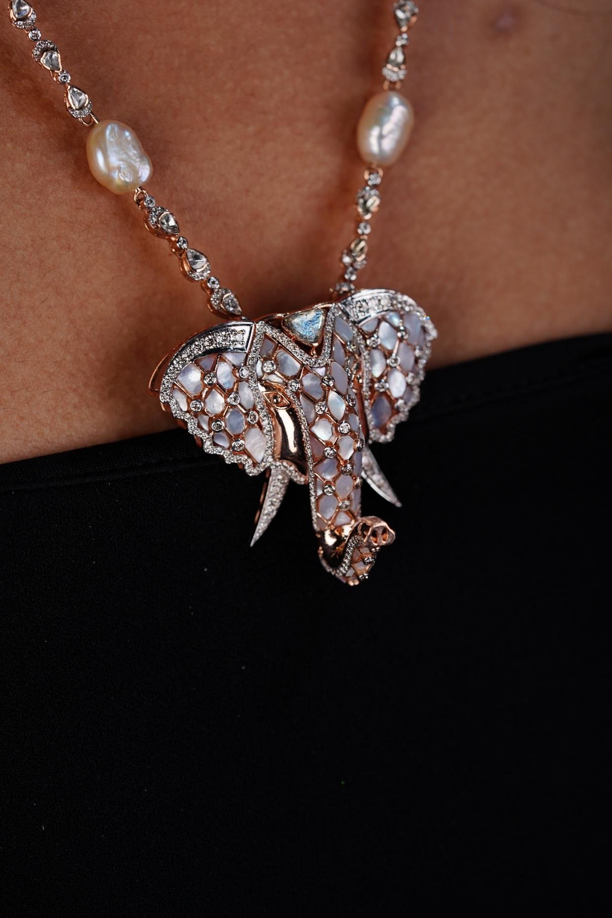 An elephant-shaped pendant necklace with diamond-studded details, worn on a pearl-accented chain.