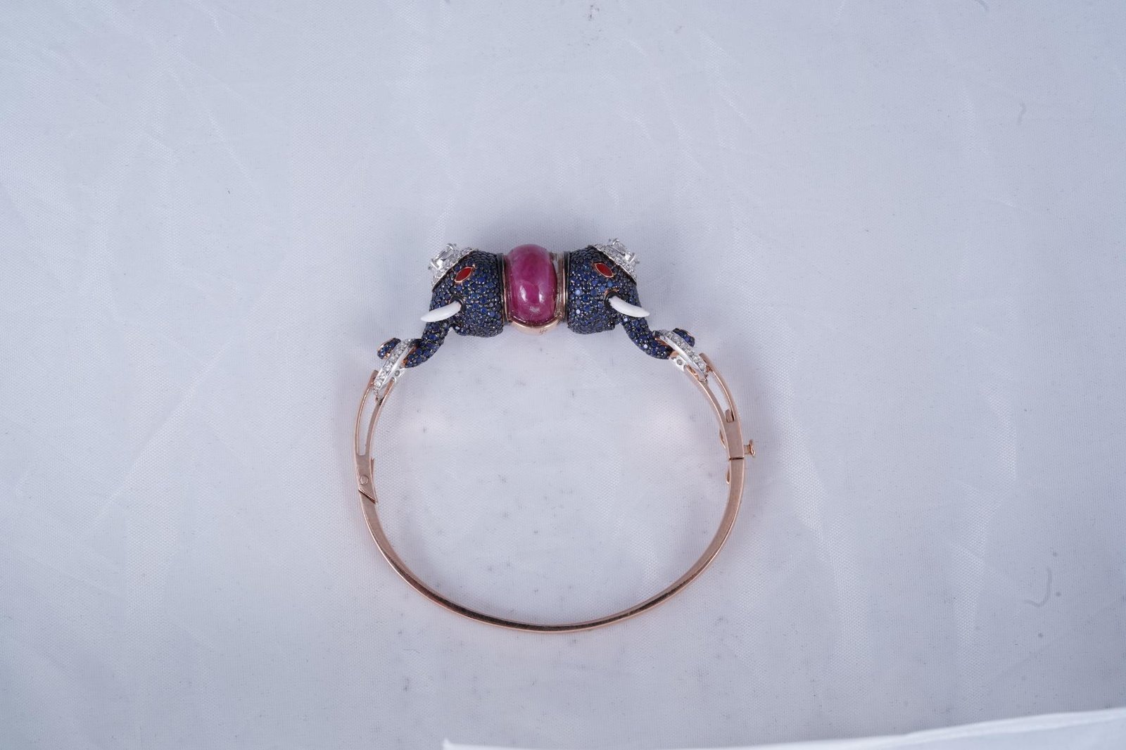 A rose‑gold polki bangle featuring two blue‑stone‑embellished elephant heads with trunks framing a central pink ruby stone.