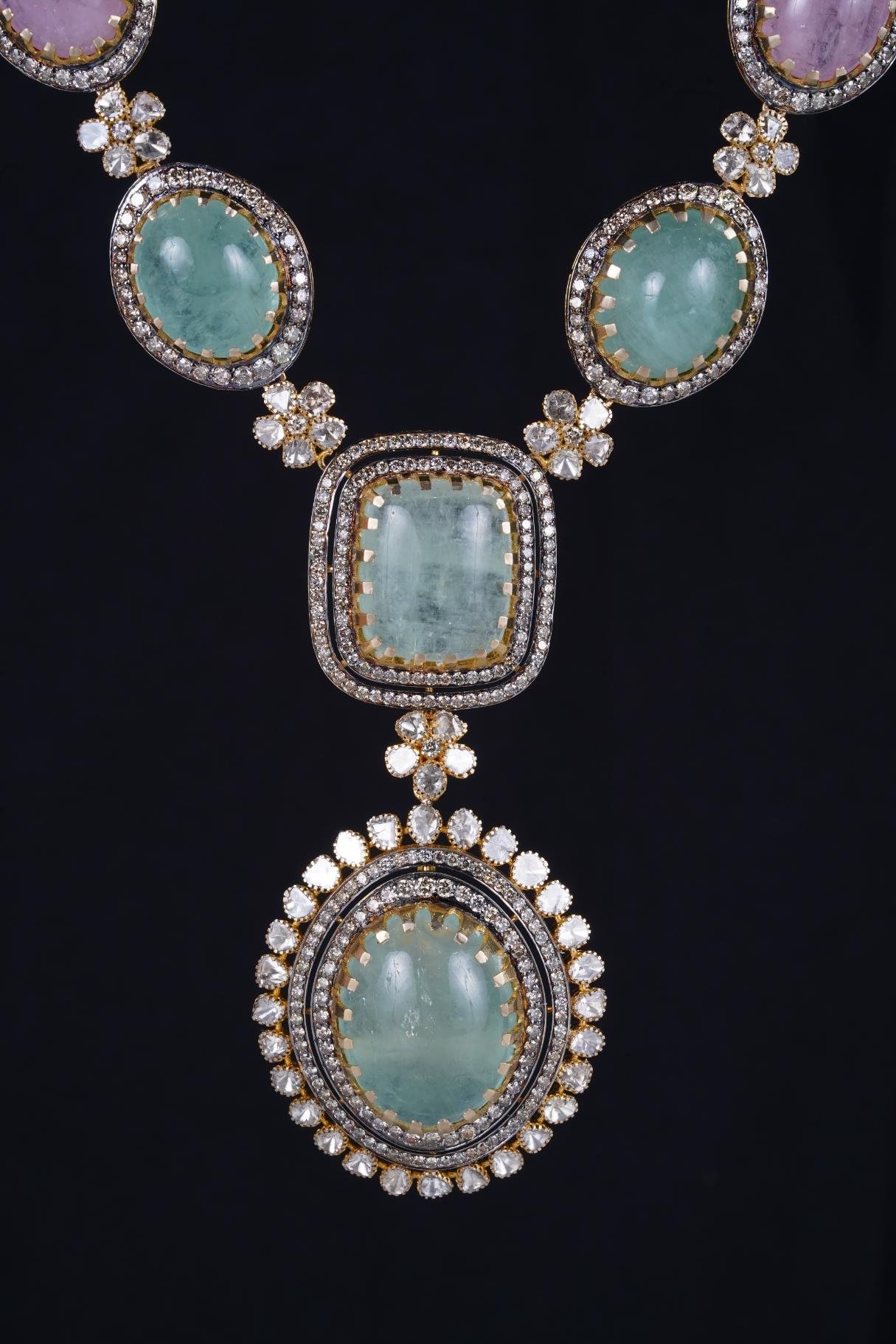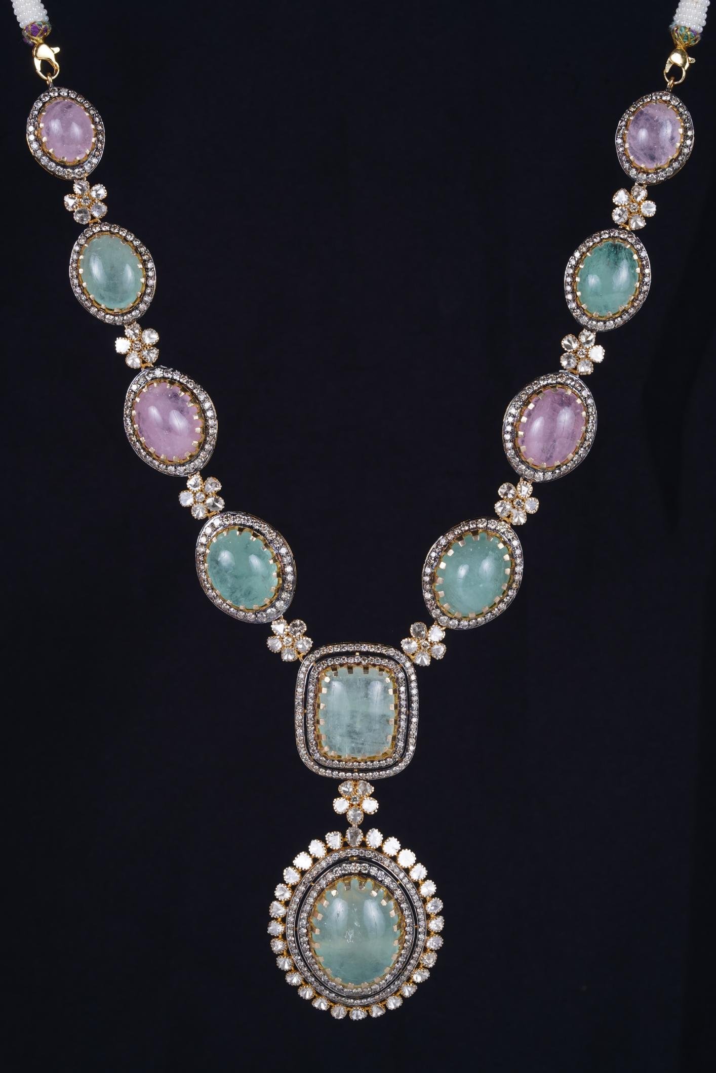 A luxurious necklace featuring pink pearls and a dazzling pendant with a central gem surrounded by diamonds, pink stones, and blue accents.