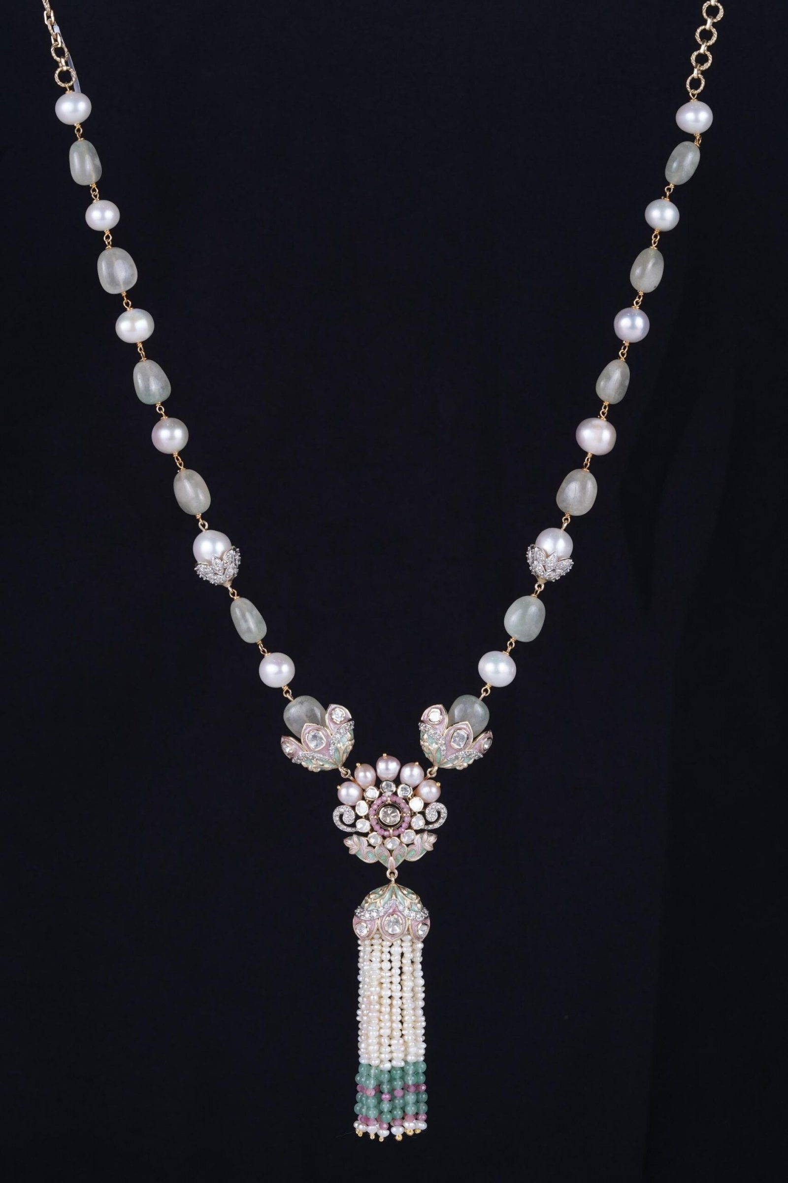 A polki necklace with an alternating chain of pearl and iridescent green beads, featuring a large diamond‑studded pendant with a white pearl drop.