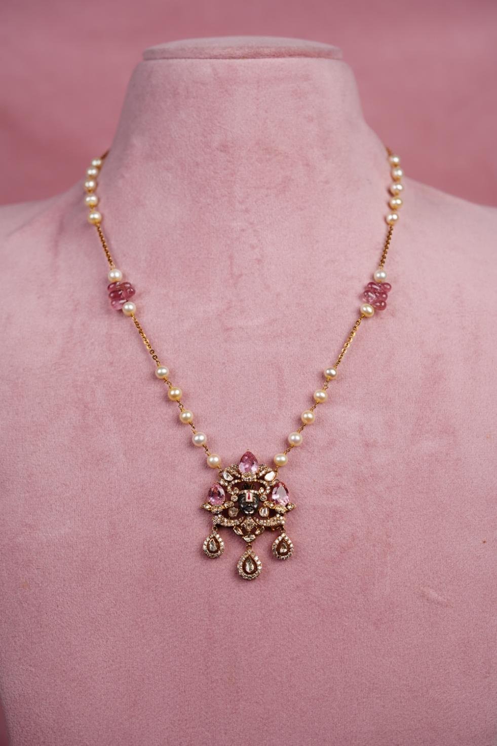 A gold pearl-chain necklace featuring a Venkateswara (Balaji) pendant with pink gemstones and diamond accents.