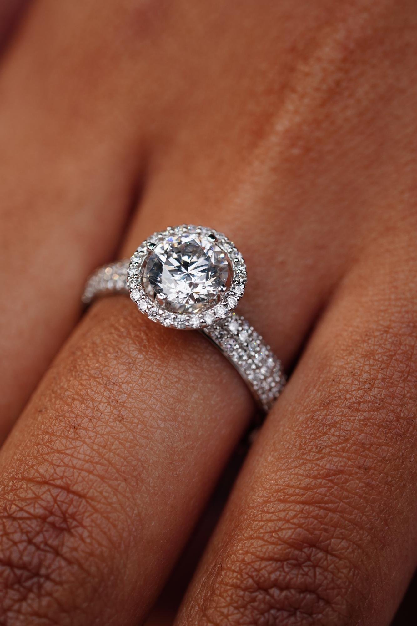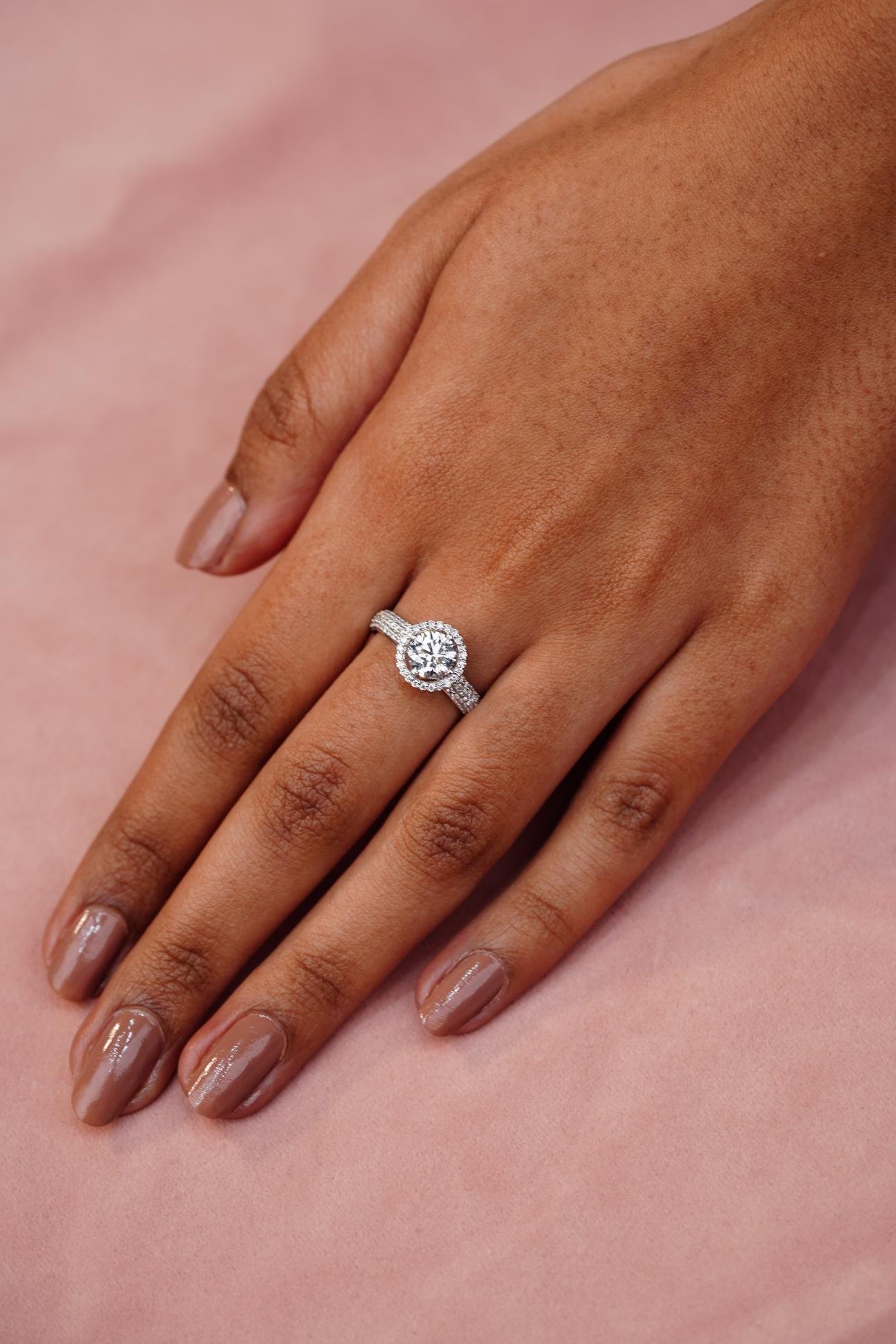 A classic engagement ring with a brilliant round center diamond surrounded by a halo of smaller diamonds and additional pave diamonds on the tapered band.