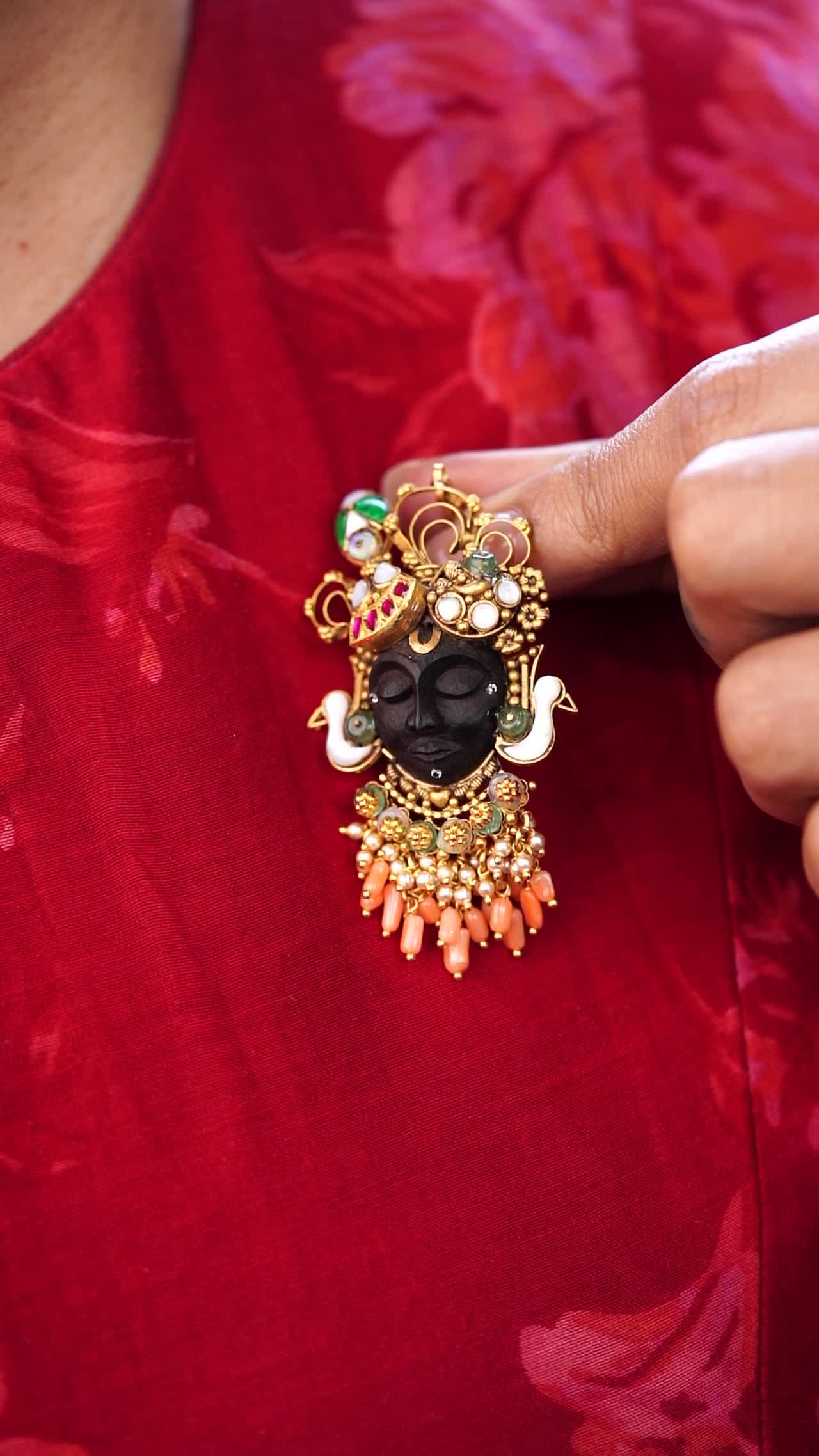 The sreenath ji pendant is a gold-faced decorative charm featuring a black-faced deity (likely Krishna) with intricate gold jewellery, gemstones, and a dangling leaf motif.