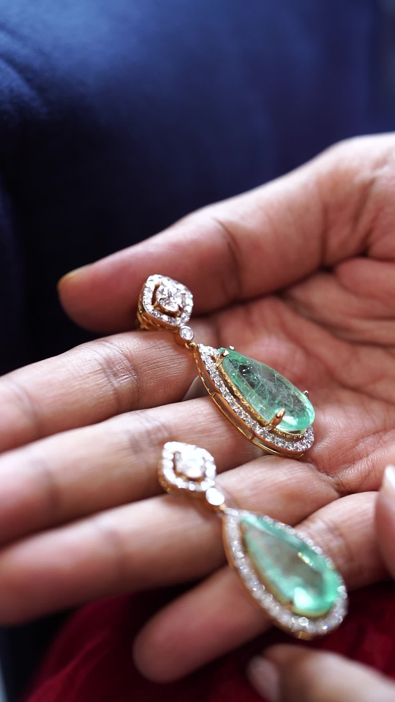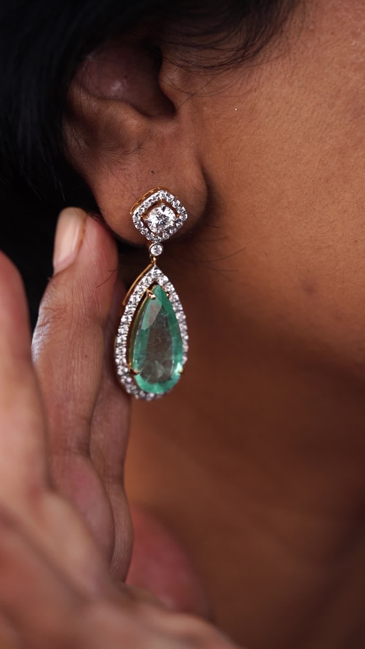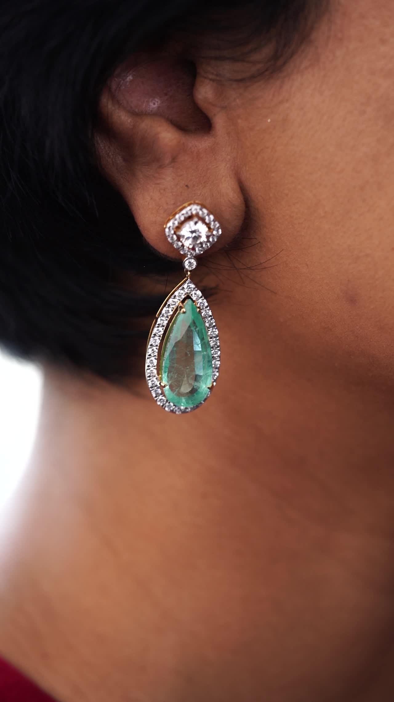 A gold toned diamond-studded earrings with a teardrop aqua-green gemstone surrounded by sparkling white diamonds.