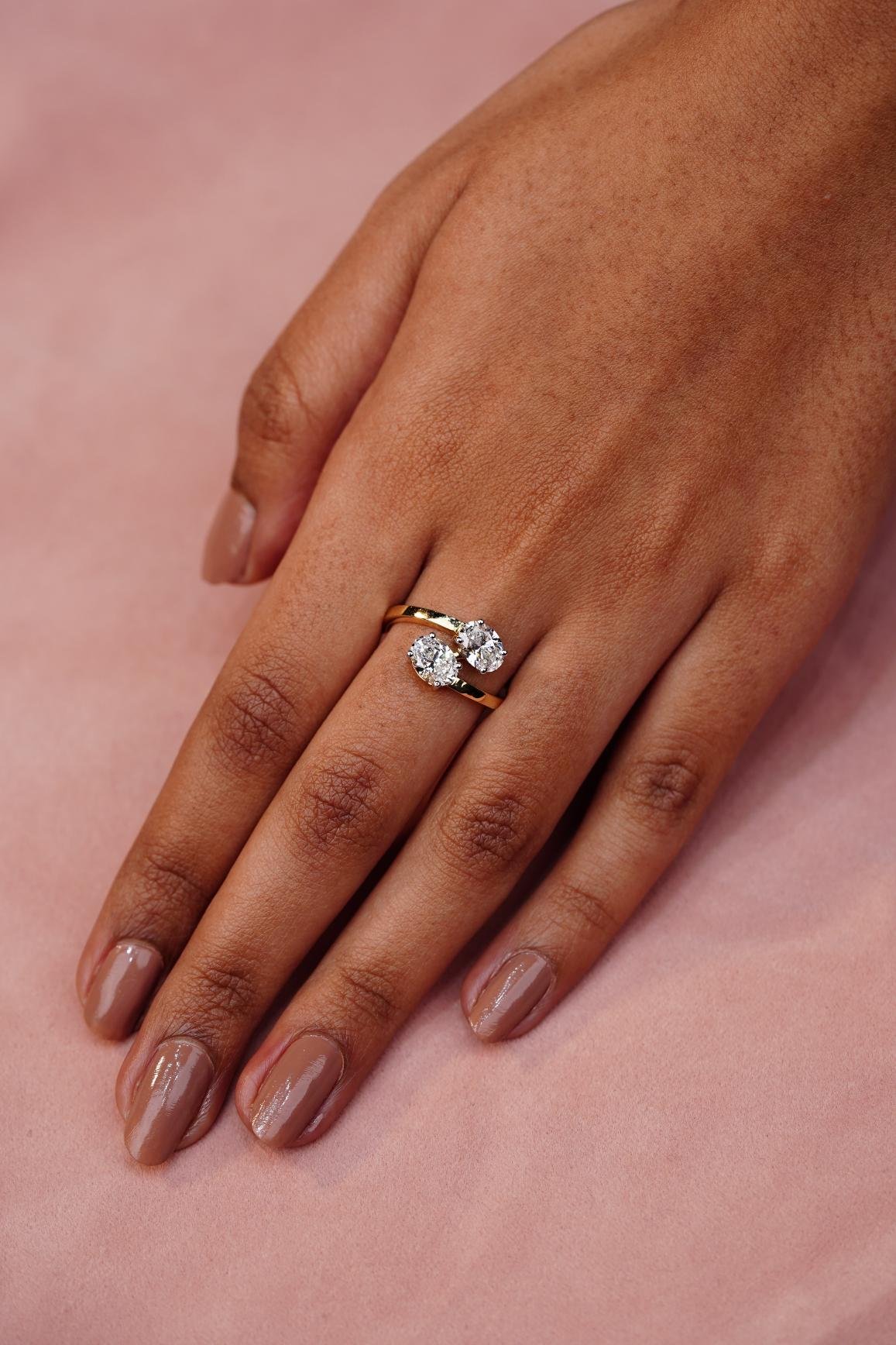 A gold band with two oval-cut diamonds set side by side in a two-stone ring design.