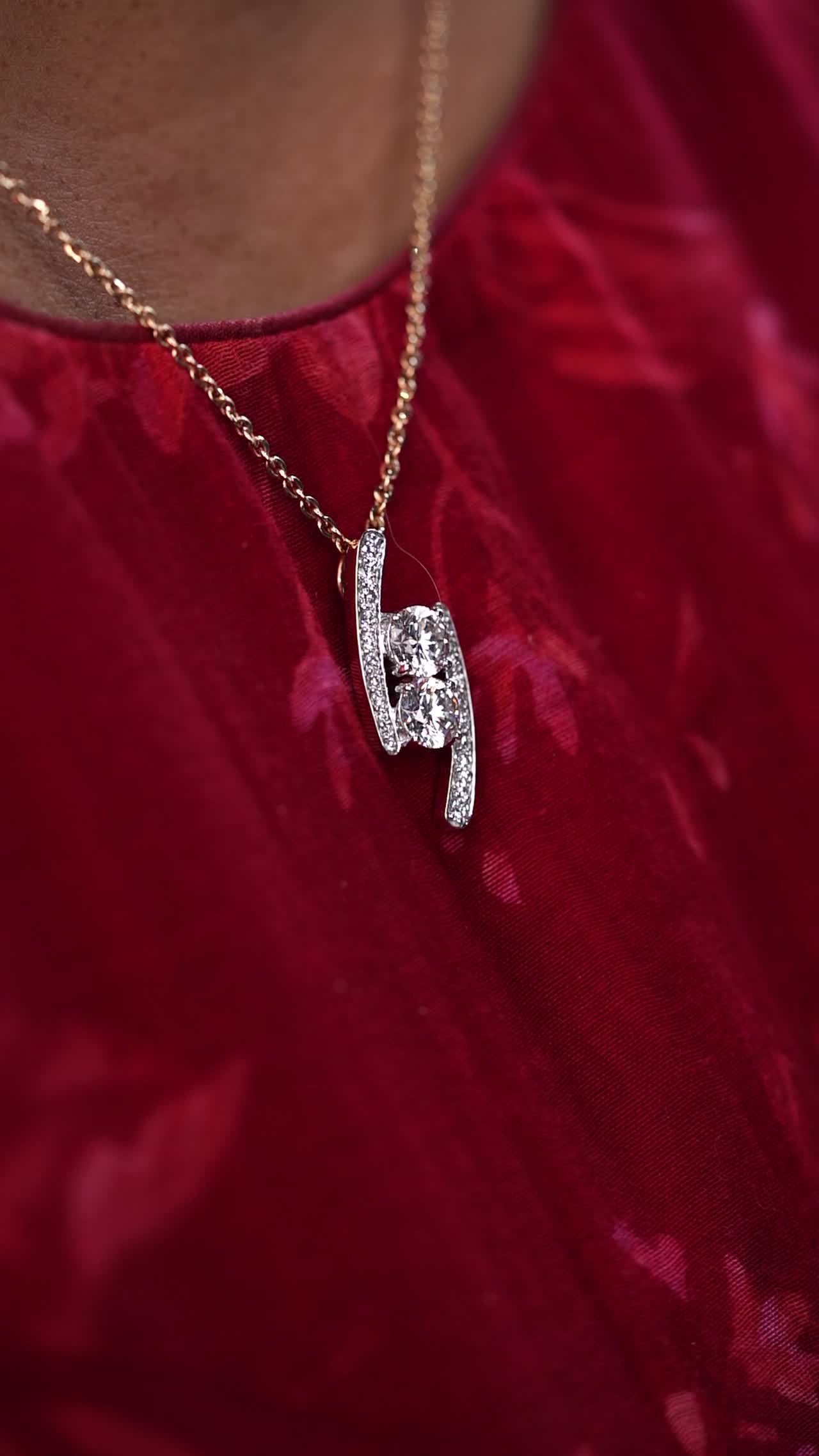 A chain with a diamond-studded shaka hand holding two round solitaire diamond stones.