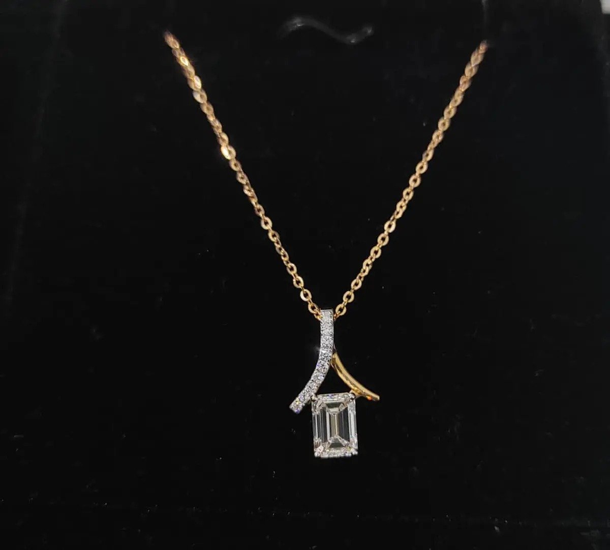 A sleek rose‑gold chain with a modern pendant featuring a diamond‑paved “V” that elegantly cradles a large emerald‑cut crystal diamond.