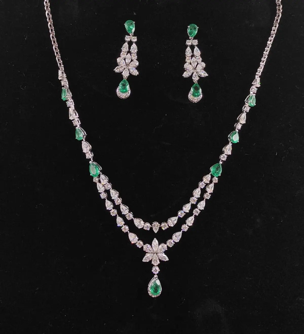 An exquisite two‑layer necklace woven with shimmering diamond petals and vibrant emerald teardrops, complemented by matching emerald‑capped diamond floral earrings that add a burst of green brilliance to any ensemble.
