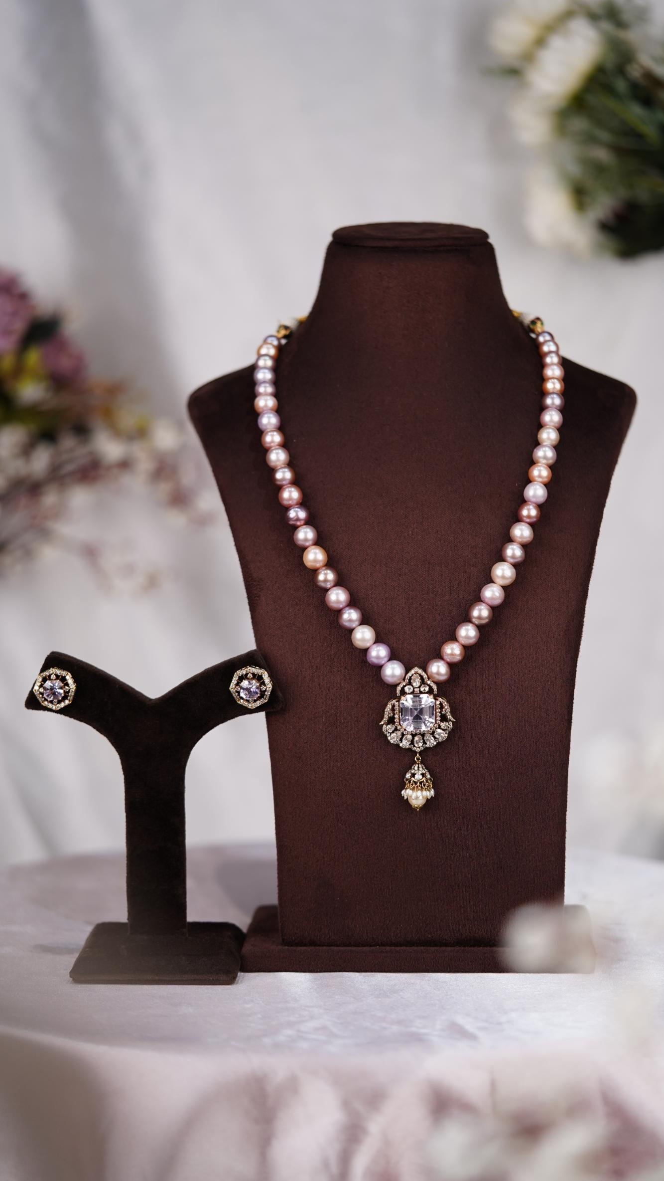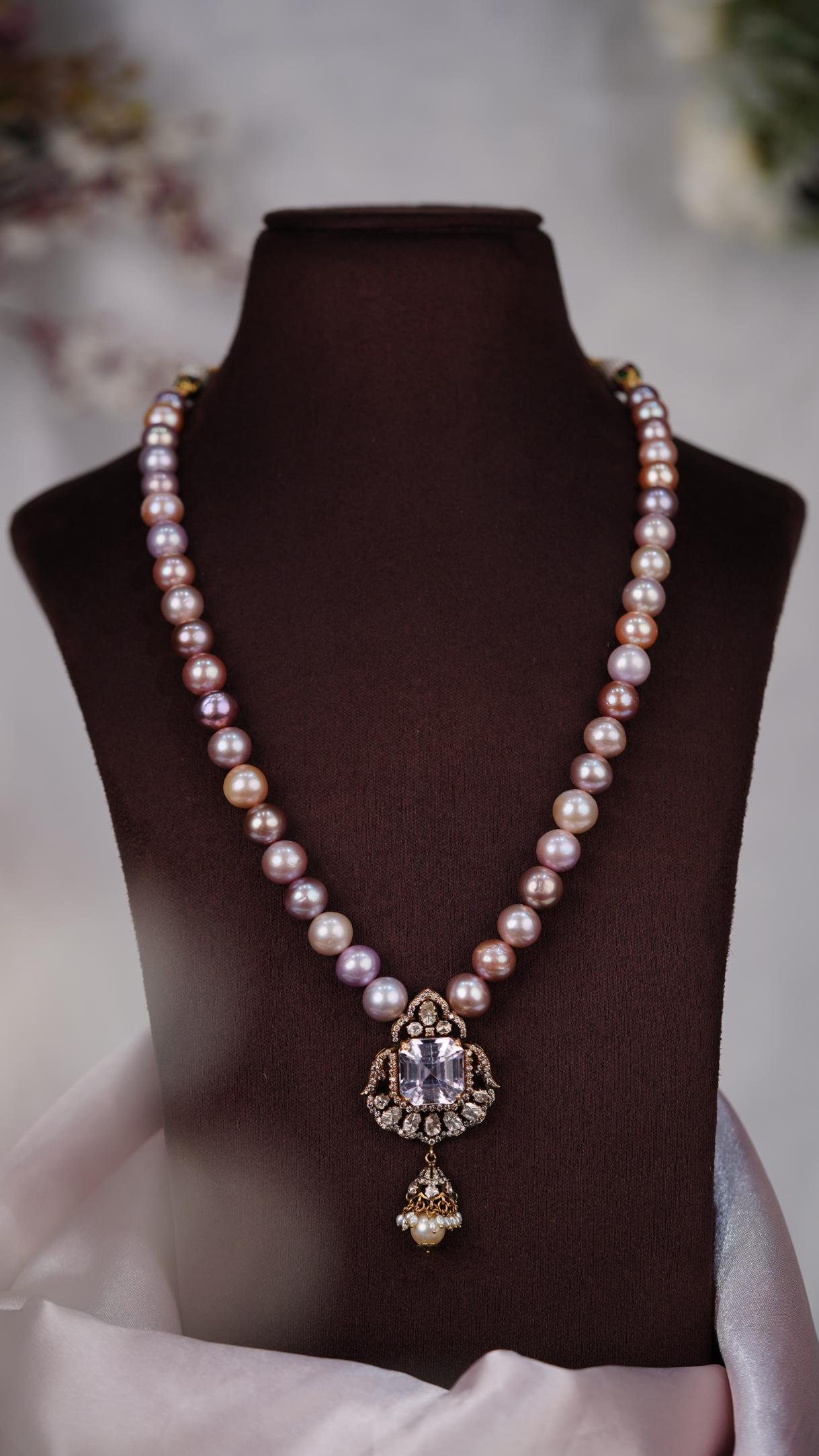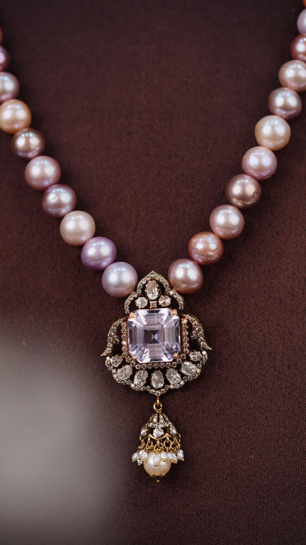 A classic pink pearl necklace with a large diamond-studded pendant and a pearl drop at the bottom.