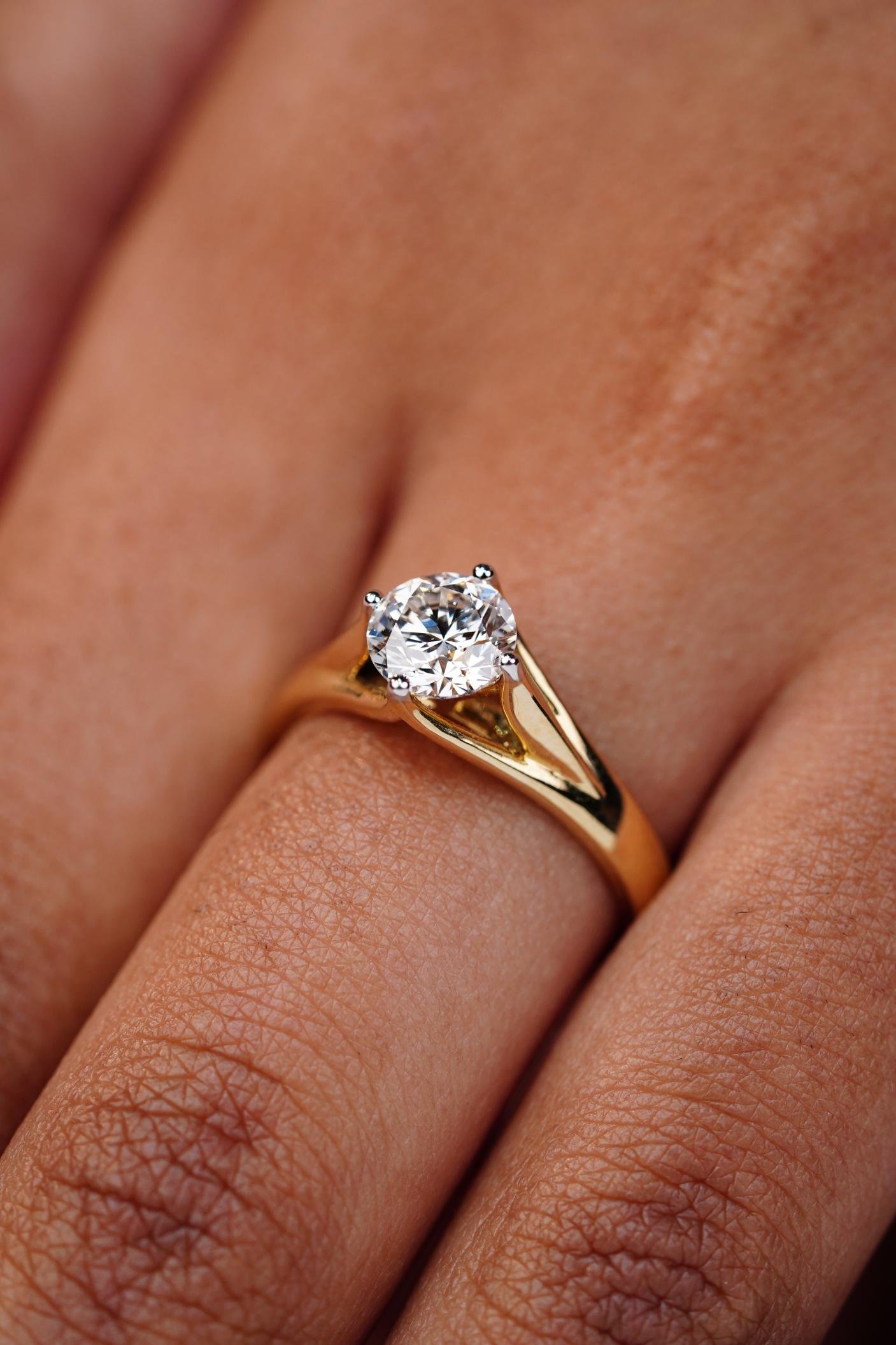 A classic gold solitaire engagement ring with a brilliant-cut diamond set in a simple, elegant band.