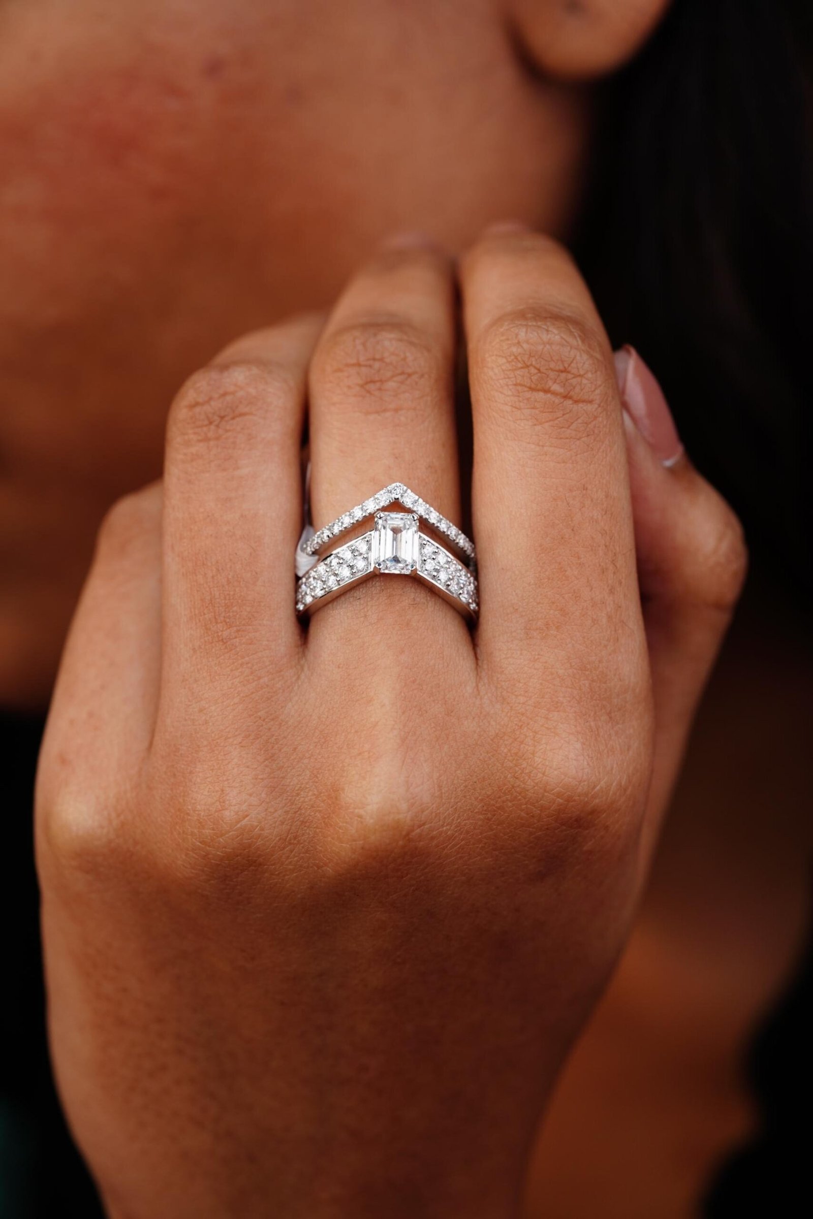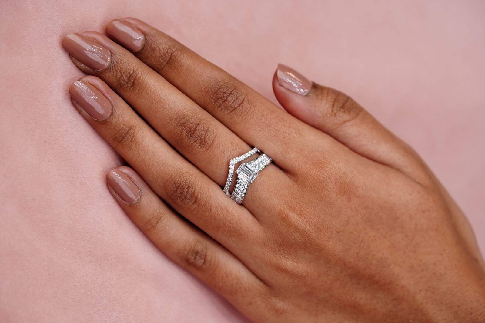 A double-row diamond wedding band with a chevron design featuring princess-cut stones.