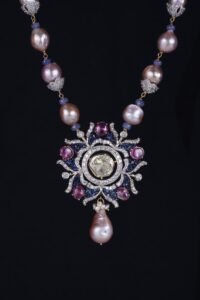 A luxurious necklace featuring pink pearls, sparkling diamond accents, and a central teardrop pendant with an orange floral design, flanked by green gemstone drops.