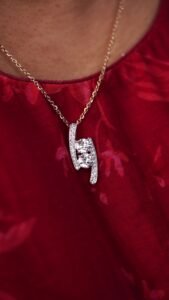 A chain with a diamond-studded shaka hand holding two round solitaire diamond stones.