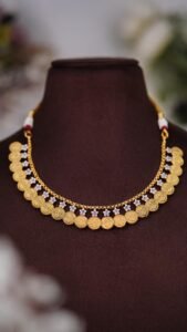 This is a gold necklace with scalloped gold discs and floral-studded accents.