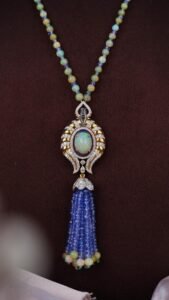 A pearl chain necklace with an ornate silver pendant featuring a central stone and a vibrant blue tassel.